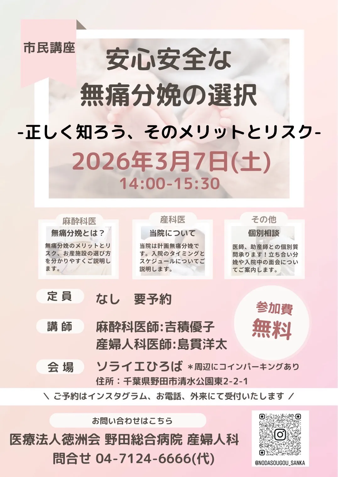 申し込み:Instagram / 外来窓口 / 電話04-7124-6666(産婦人科)へお願いいたします
